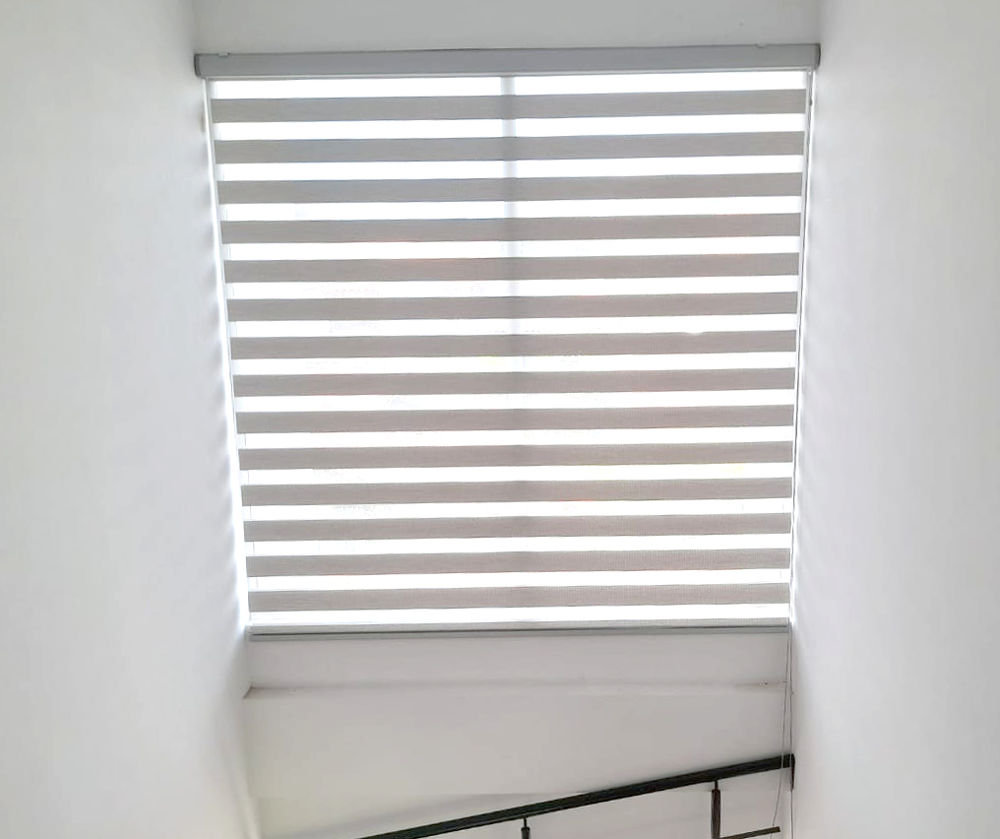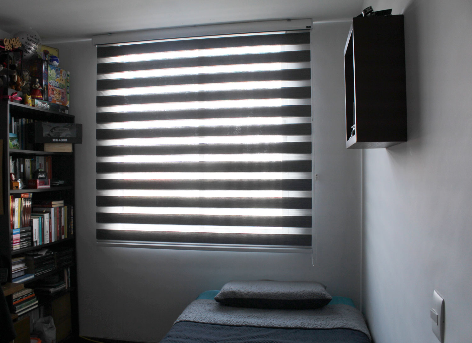 Esta persiana se compone por franjas opacas y traslúcidas que se intercalan a lo largo de la tela, permitiendo controlar el nivel de luz y privacidad. El sistema enrollable está cubierto por una cenefa de aluminio y el control de gravedad usa un perfil del mismo material, destacando por su sobriedad y elegancia.